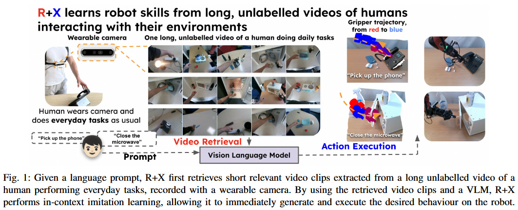 We present R+X, a framework which enables robots to learn skills from long, unlabelled, first-person videos of humans performing everyday tasks. Given a language command from a human, R+X first retrieves short video clips containing relevant behaviour, and then executes the skill by conditioning an in-context imitation learning method (KAT) on this behaviour. By leveraging a Vision Language Model (VLM) for retrieval, R+X does not require any manual annotation of the videos, and by leveraging in-context learning for execution, robots can perform commanded skills immediately, without requiring a period of training on the retrieved videos. Experiments studying a range of everyday household tasks show that R+X succeeds at translating unlabelled human videos into robust robot skills, and that R+X outperforms several recent alternative methods. Videos and code are available at this https URL.